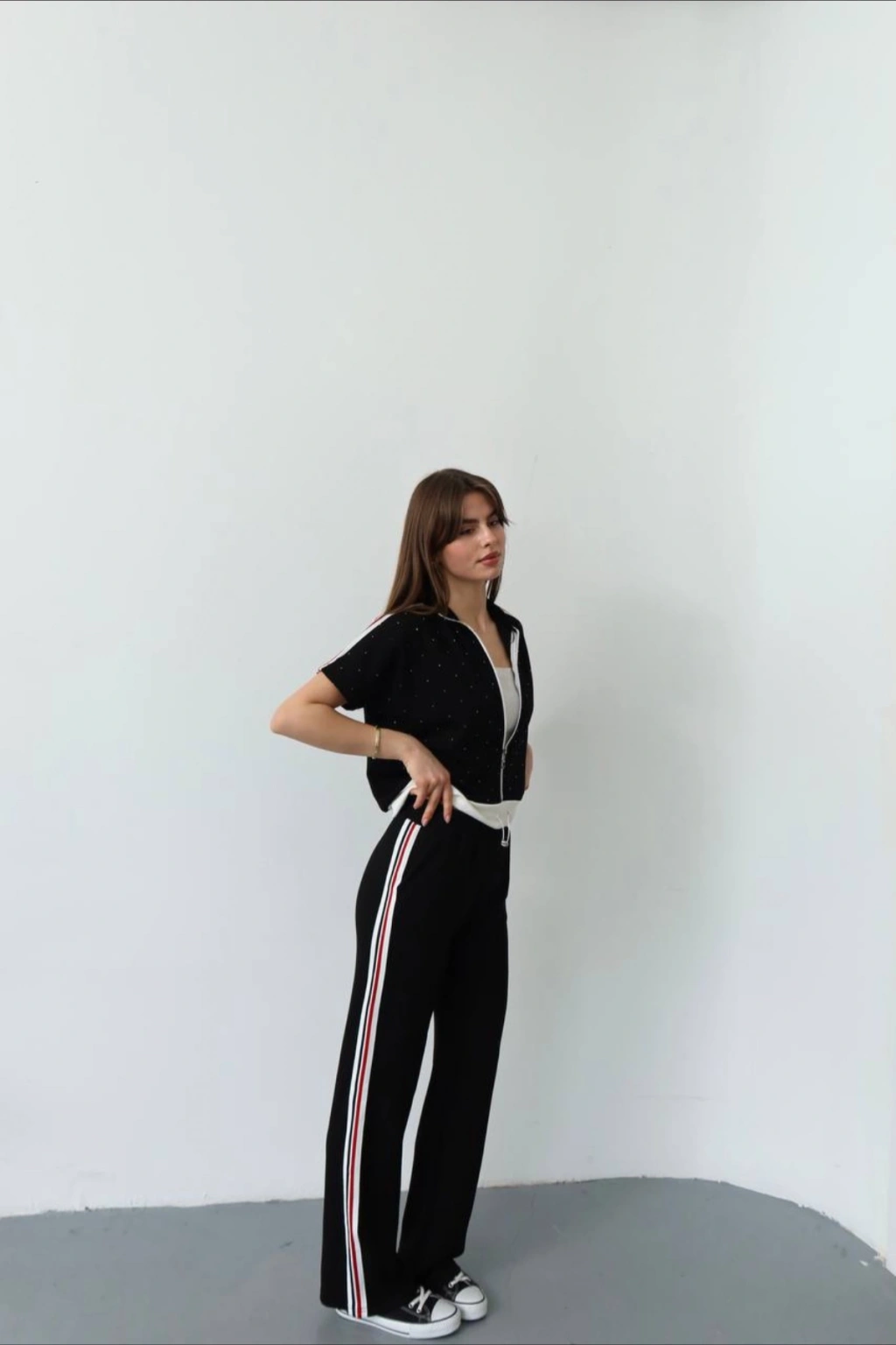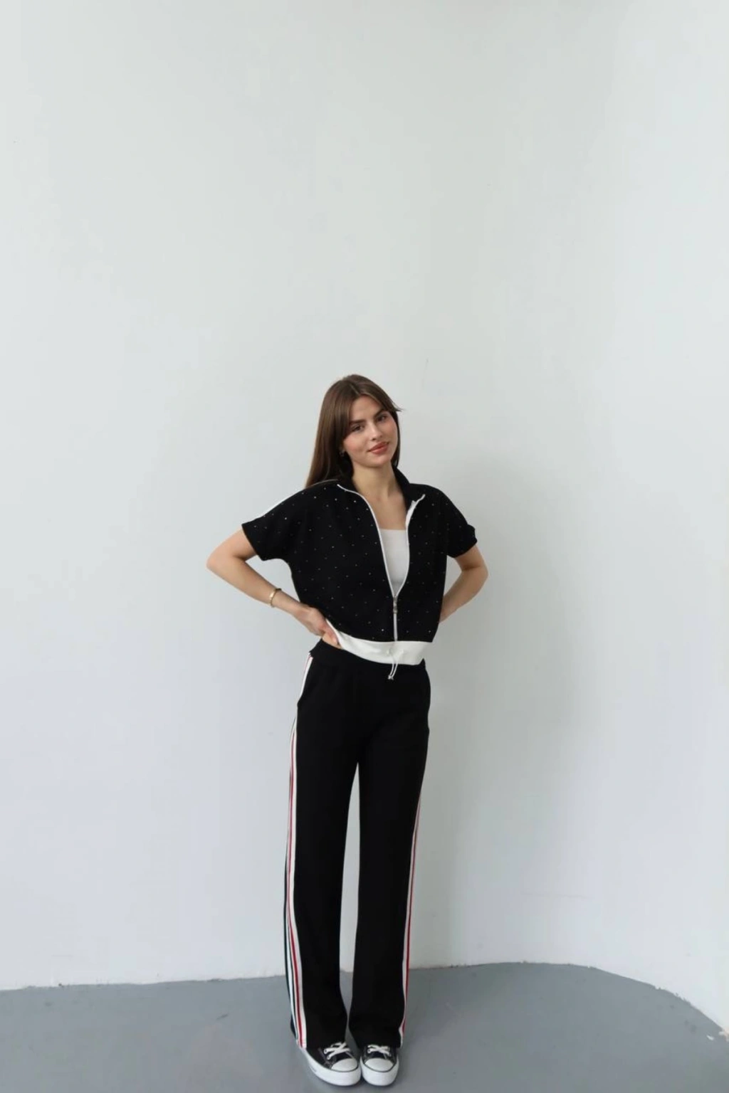 Kadın Siyah Şık Taş ve Şerit Detaylı Pantolon Fermuarlı Bluz Alt Üst İkili Yumuşacık Takım