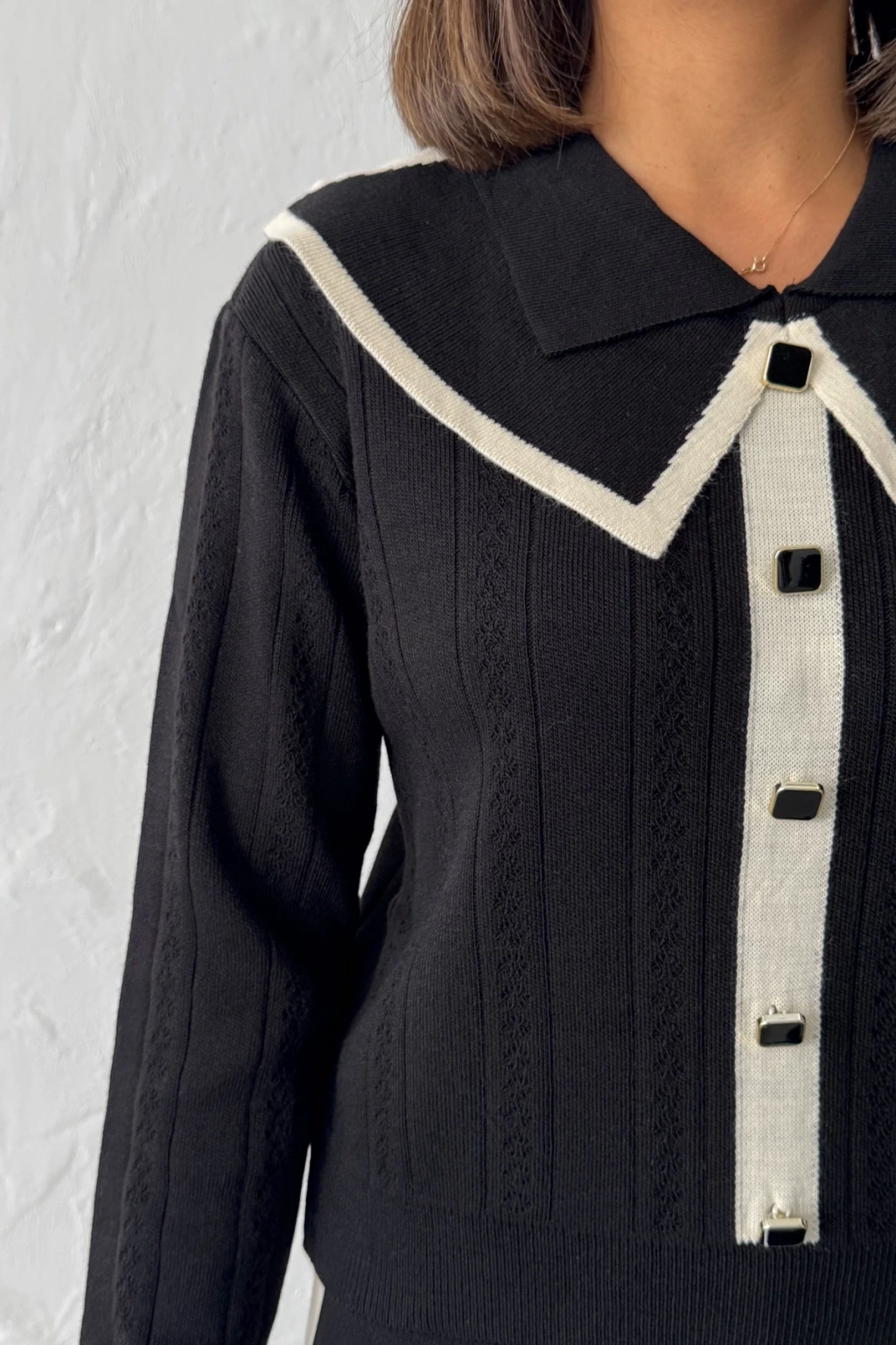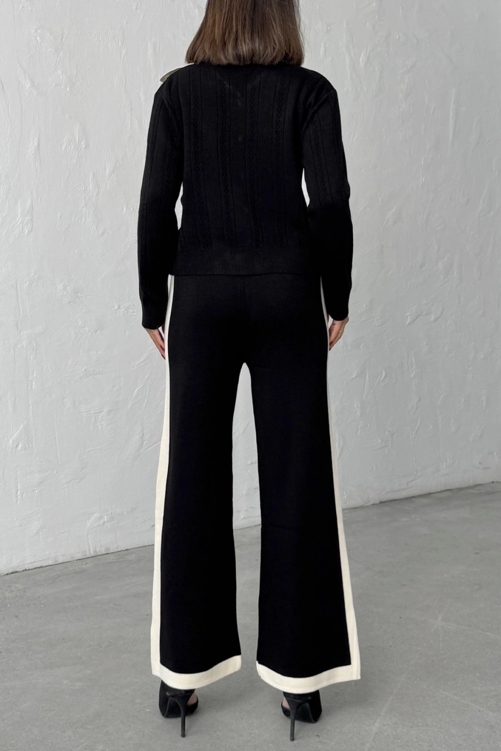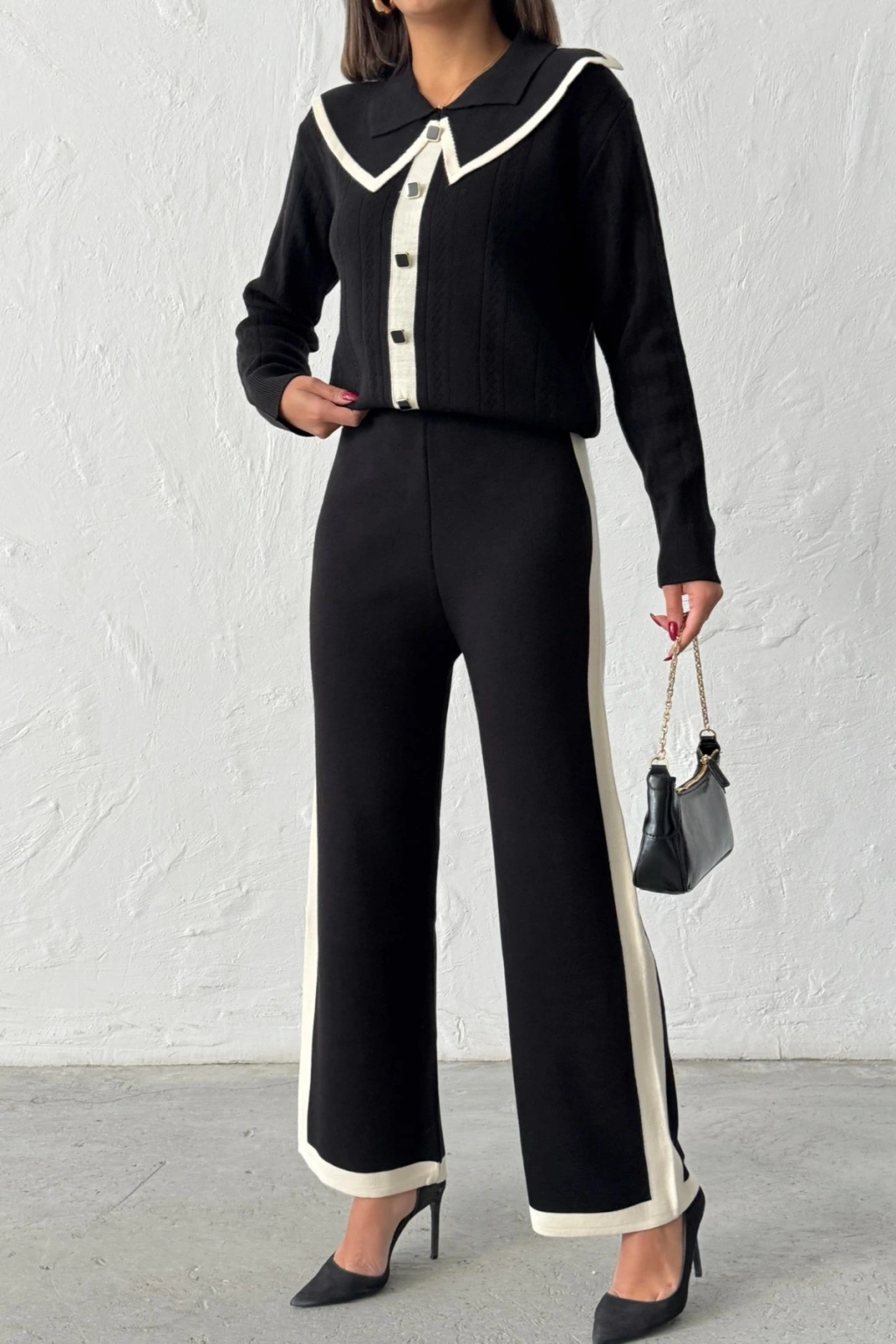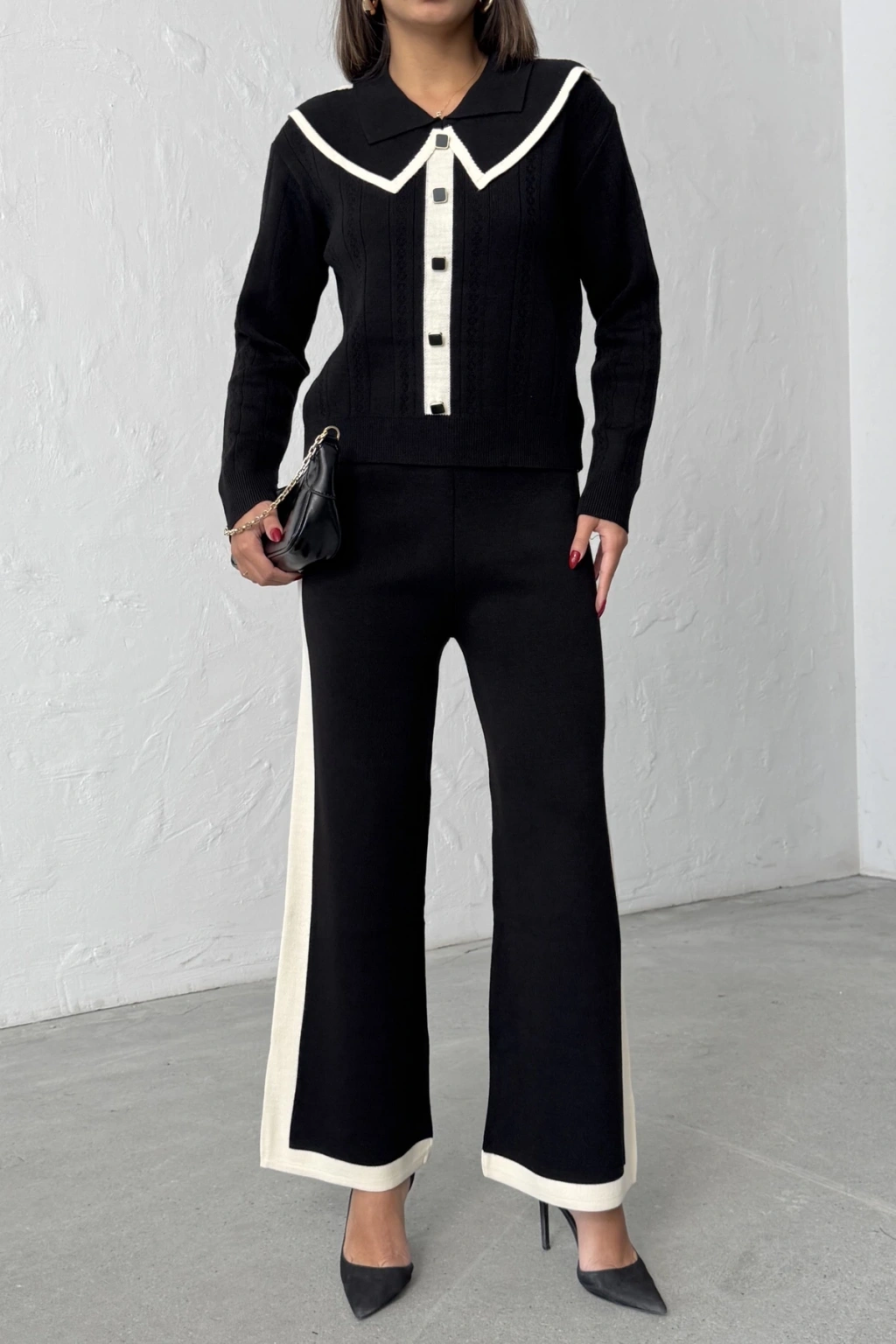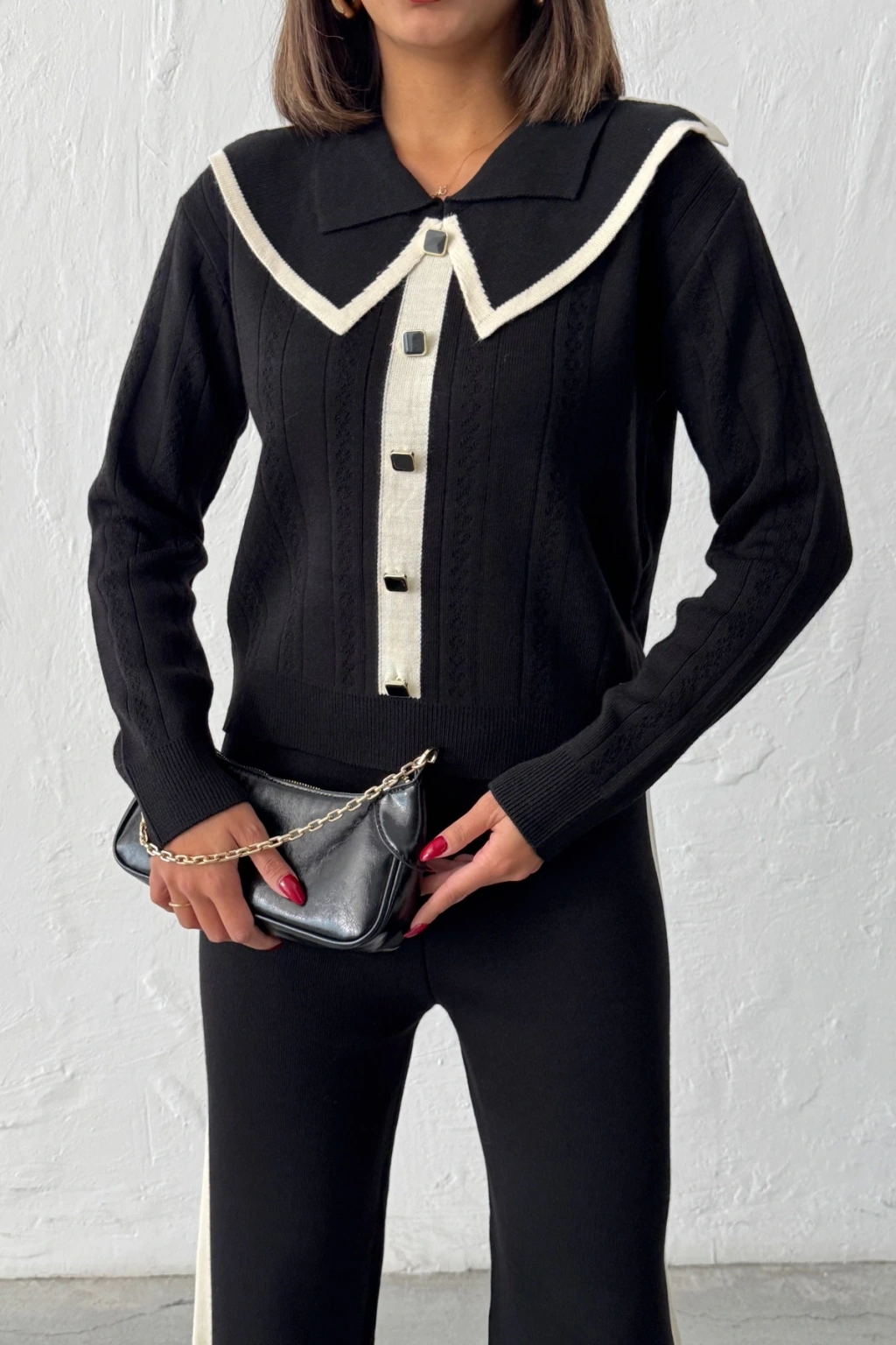 Kadın Siyah Şık Yaka Detaylı Düğmeli Bluz Pantolon Alt Üst İkili Triko Takım