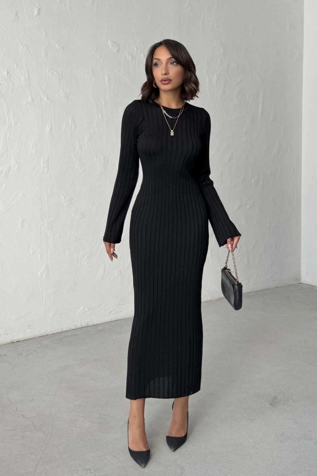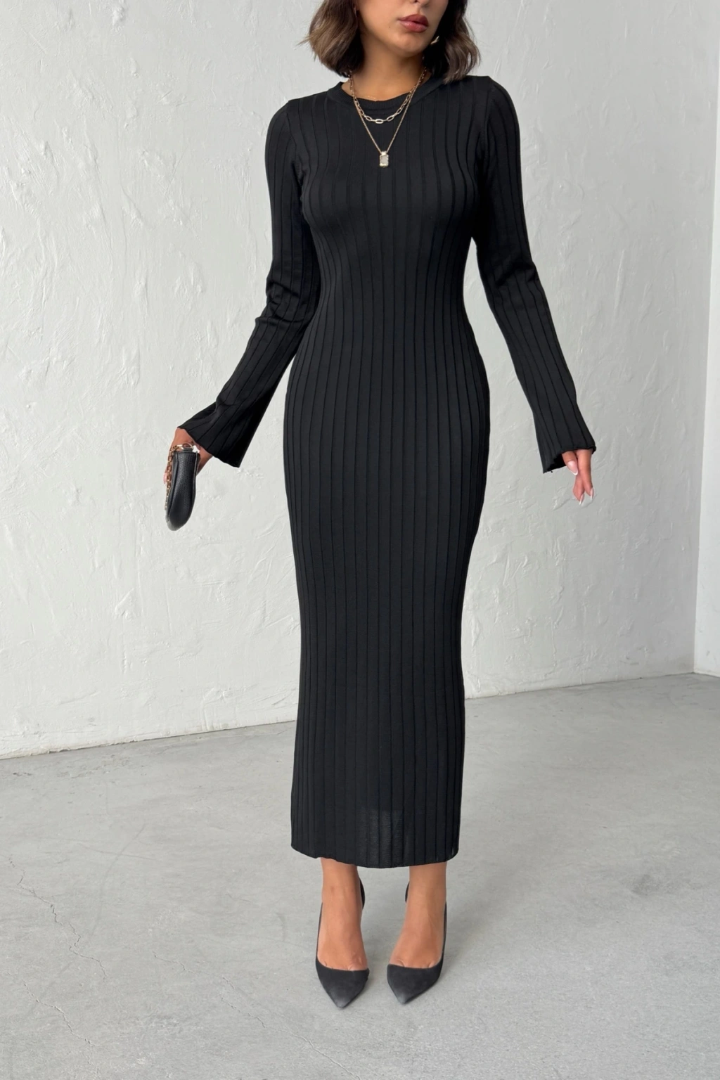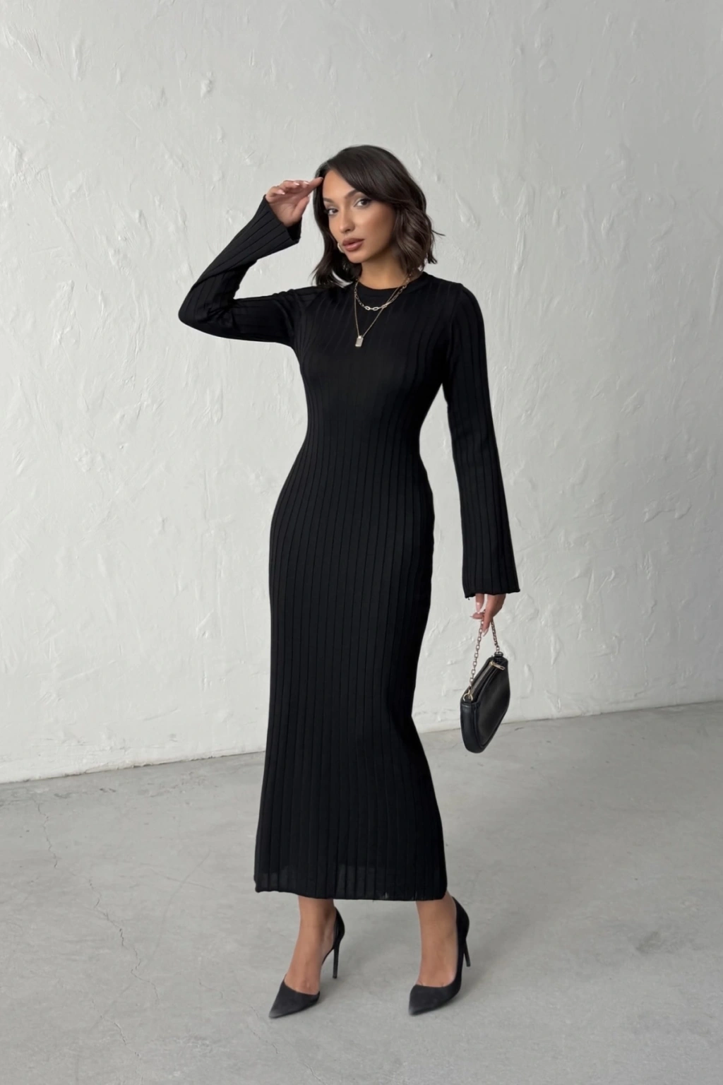 Kadın Siyah Uzun kol Şık Zarif Midi Boy Triko Elbise