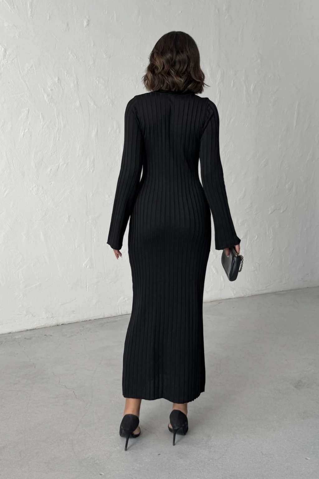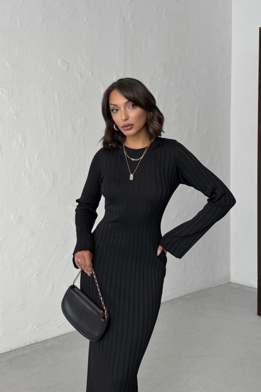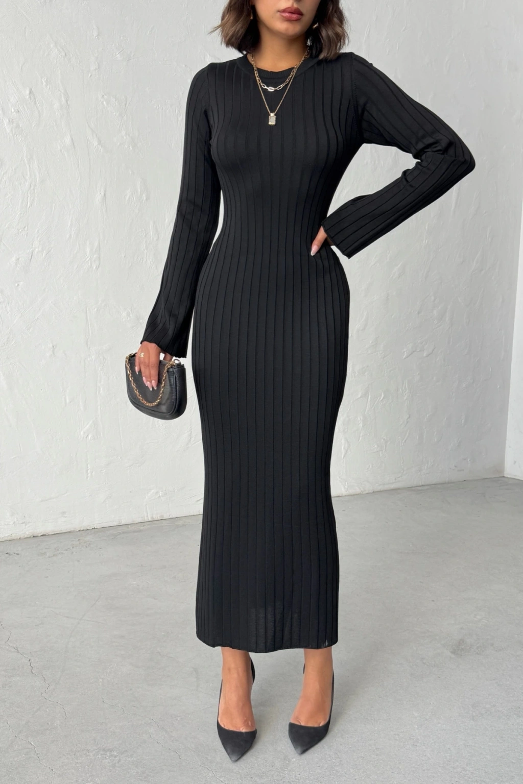 Kadın Siyah Uzun kol Şık Zarif Midi Boy Triko Elbise
