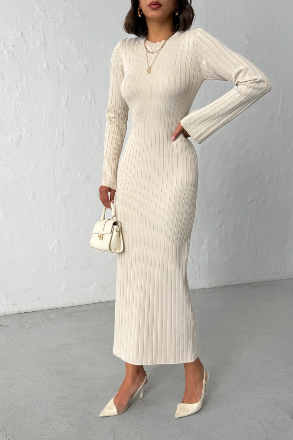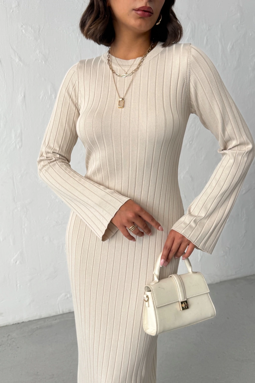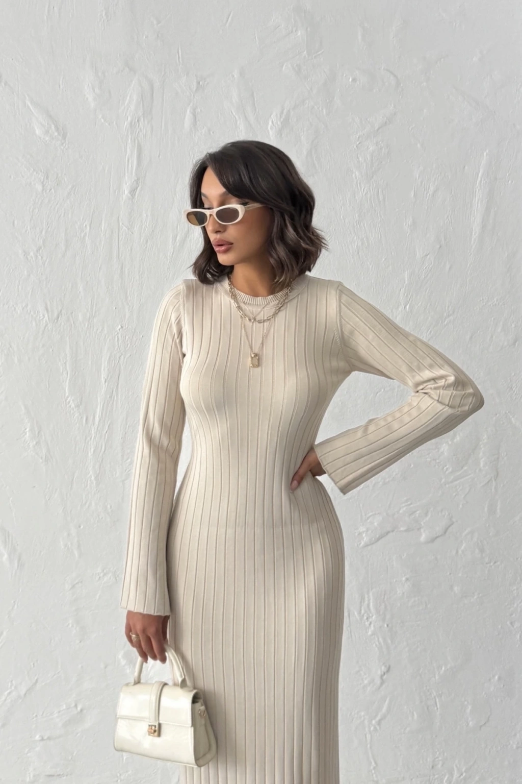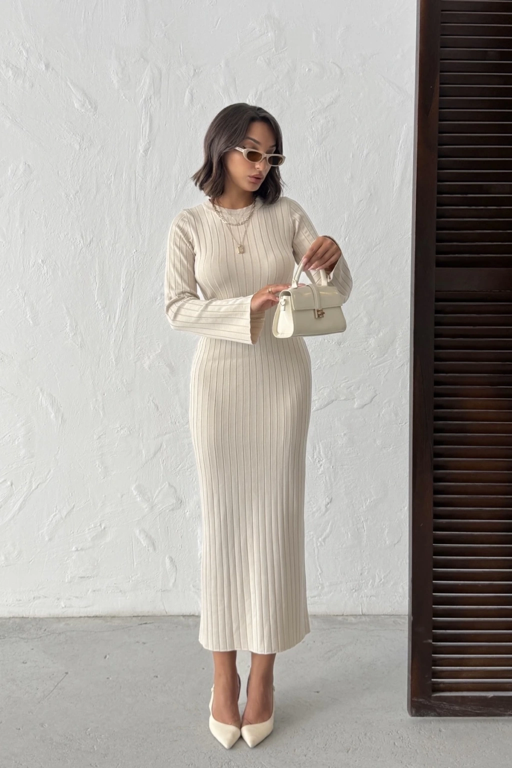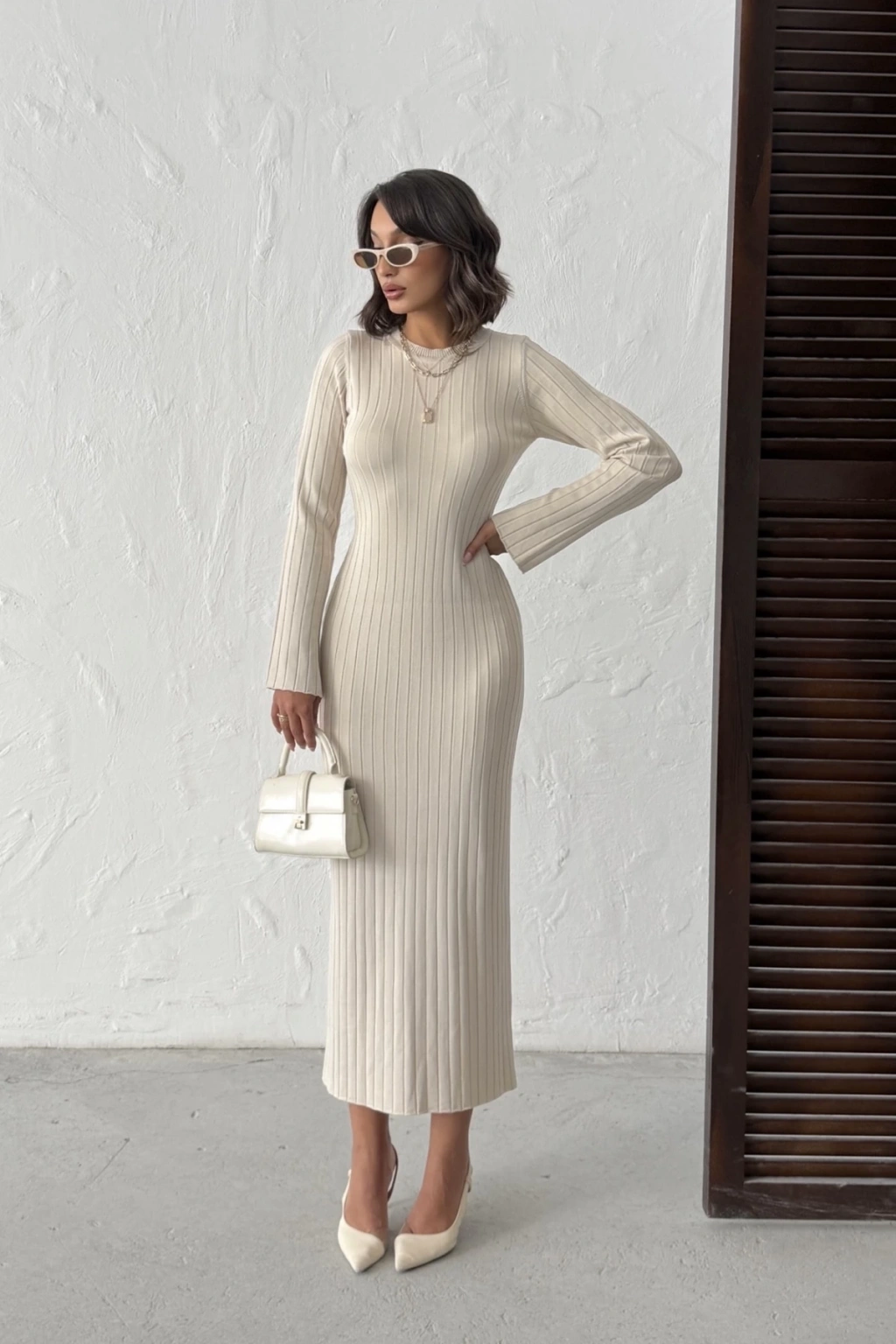 Kadın Bej Uzun kol Şık Zarif Midi Boy Triko Elbise