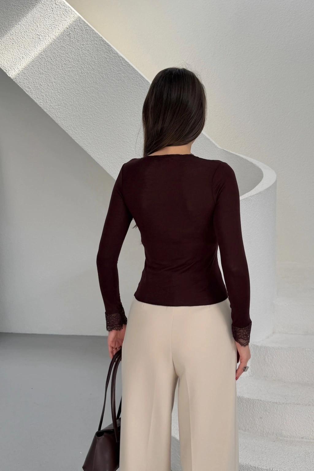 Kadın Kahverengi V Yaka Dantel Detaylı Madonna Yaka Uzun Kollu Transparan Tül Bluz