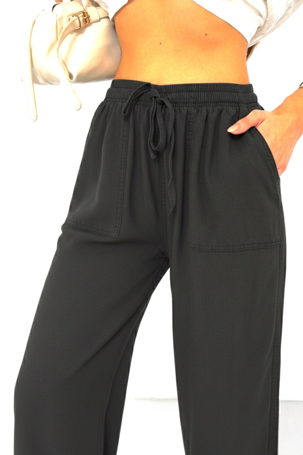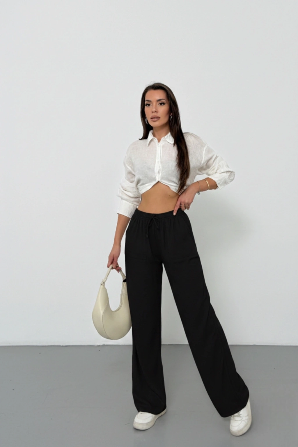 Kadın Siyah Yüksek Bel Beli Lastikli Bağcıklı Bol Paça Geniş Kesim Şık Cepli Premium Palazzo Pantolon