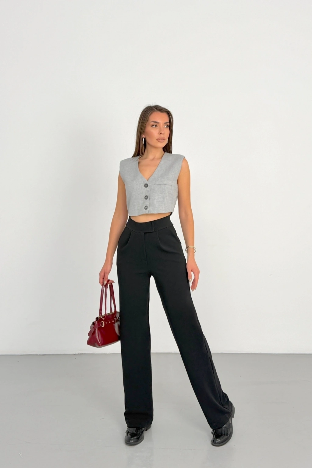 Kadın Antrasit Yüksek Bel Likralı Cırt Bant Kapamalı Geniş Paça Palazzo Pantolon
