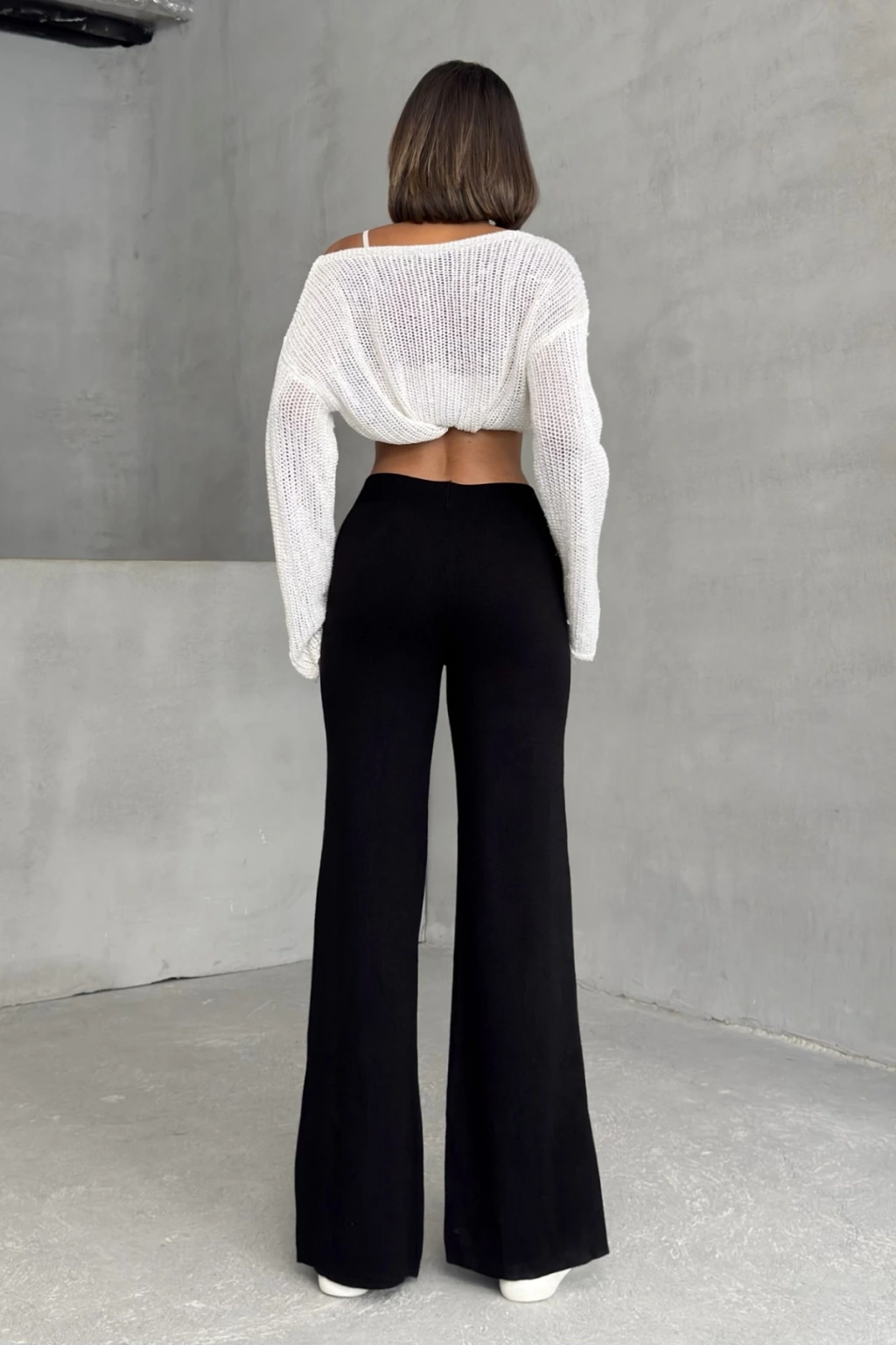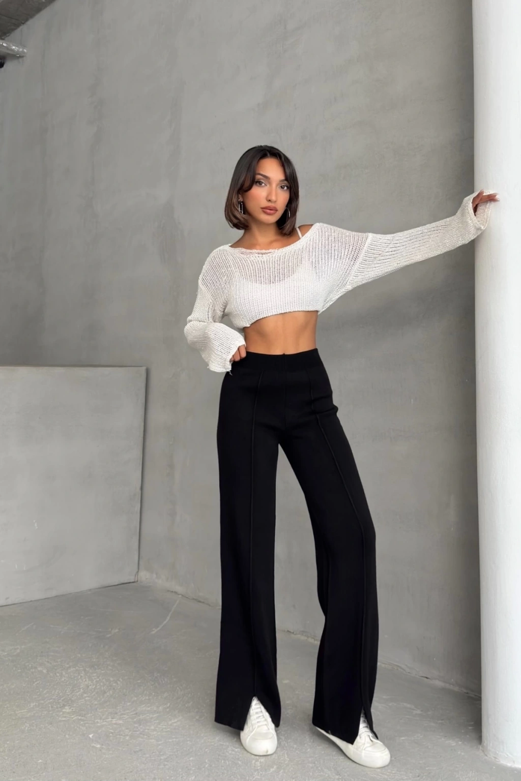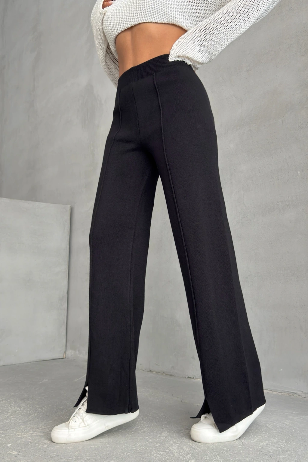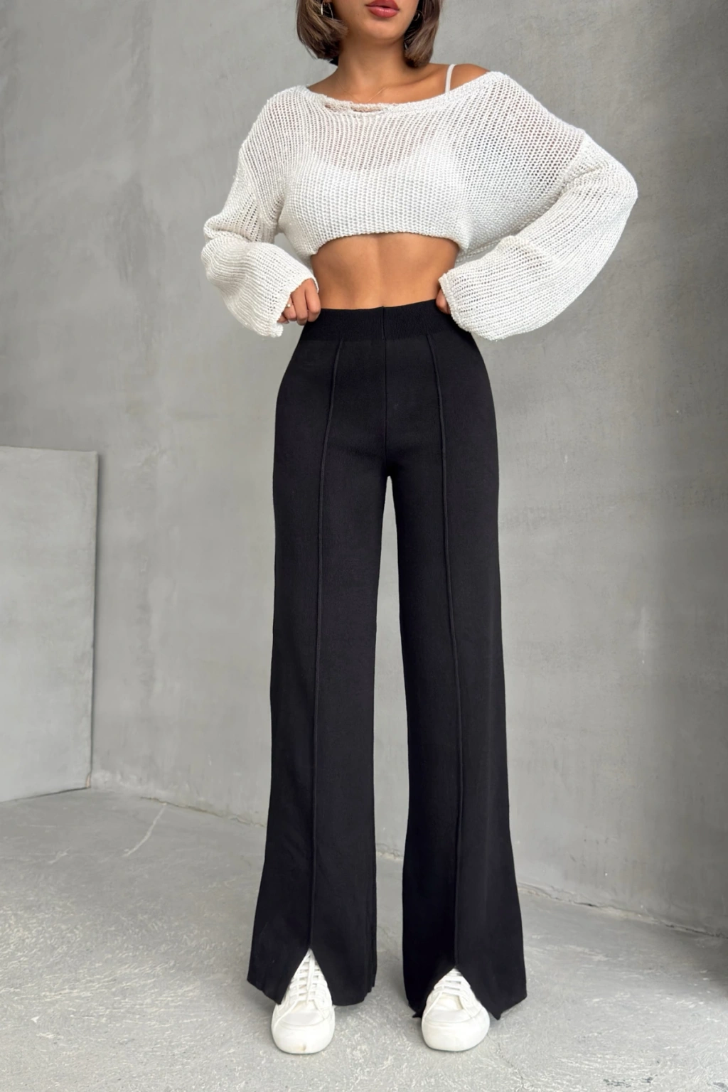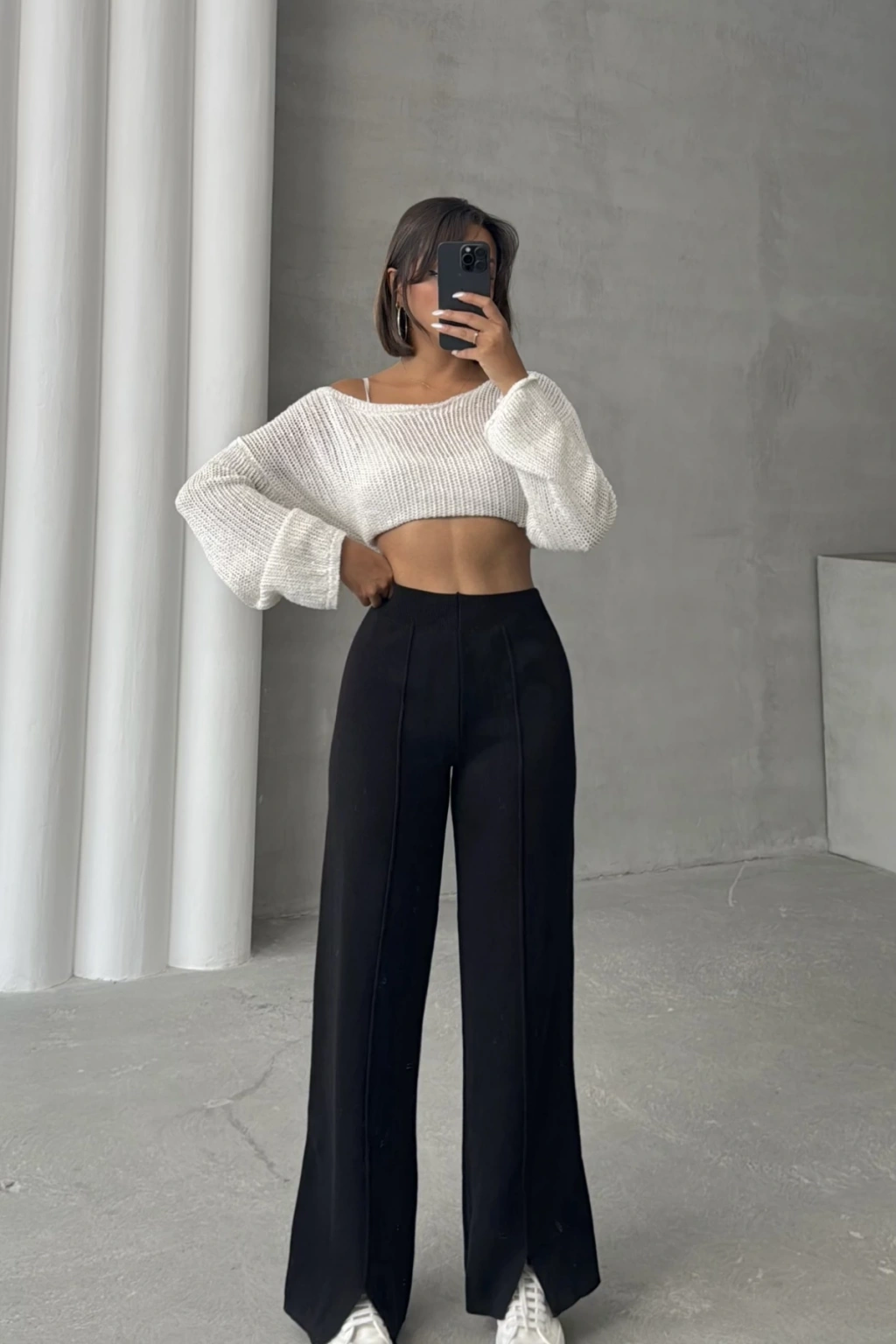 Kadın Siyah Yüksek Bel Şerit Detaylı Geniş Paça Triko Pantolon, modern kesimi ve zarif detaylarıyla hem şık hem de rahat bir stil sunar. Yüksek bel yapısı vücudu toparlayarak uzun ve zarif bir görünüm sağlarken, şerit detayları pantolona dinamik bir hava katar. Yumuşak dokulu triko kumaşı sayesinde kış aylarında sıcak tutar, gün boyu konforlu bir kullanım sunar. Geniş paça tasarımı ile güncel modaya uyum sağlayan bu pantolon, günlük kombinlerden ofis stiline kadar birçok alanda rahatlıkla tercih edilebilir.