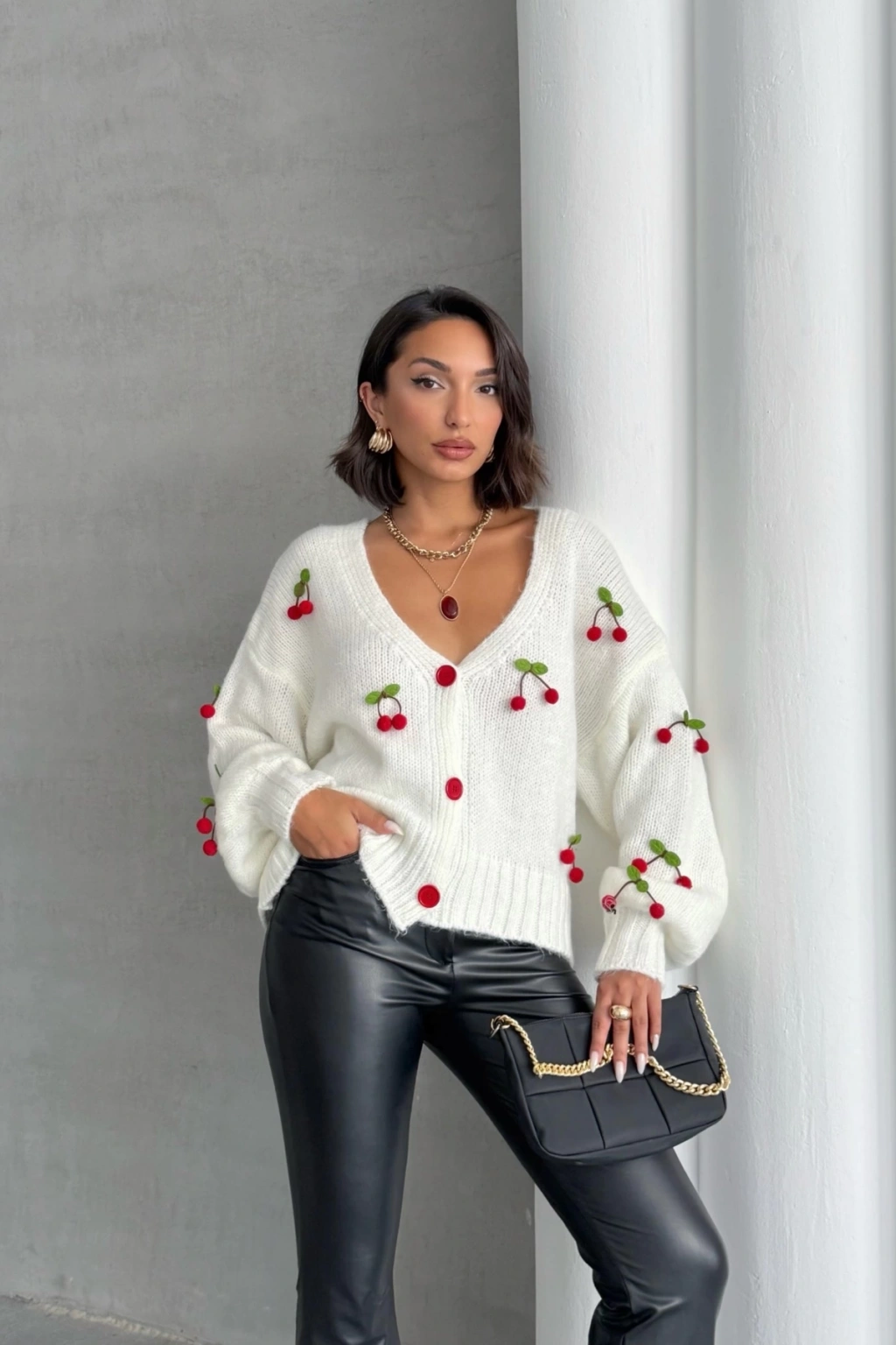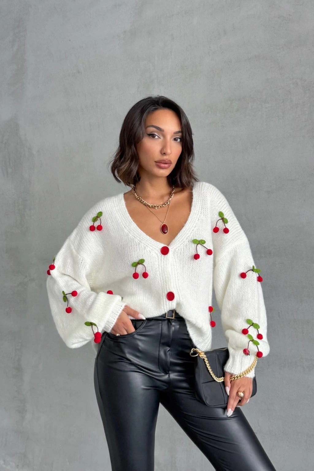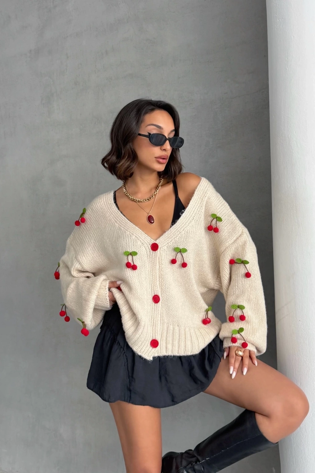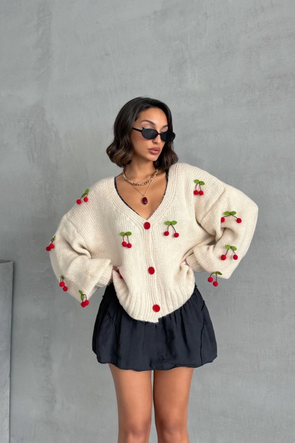 Gardırobunuza neşe katacak bu özel tasarım triko hırka, zarif dokusu ve sevimli kiraz aksesuarlarıyla tarzınıza eğlenceli bir dokunuş getiriyor. Yumuşacık triko kumaşı sayesinde hem sonbahar hem ilkbahar aylarında konforlu bir kullanım sunarken, detaylardaki özen sizi sıradanlıktan uzaklaştırıyor.