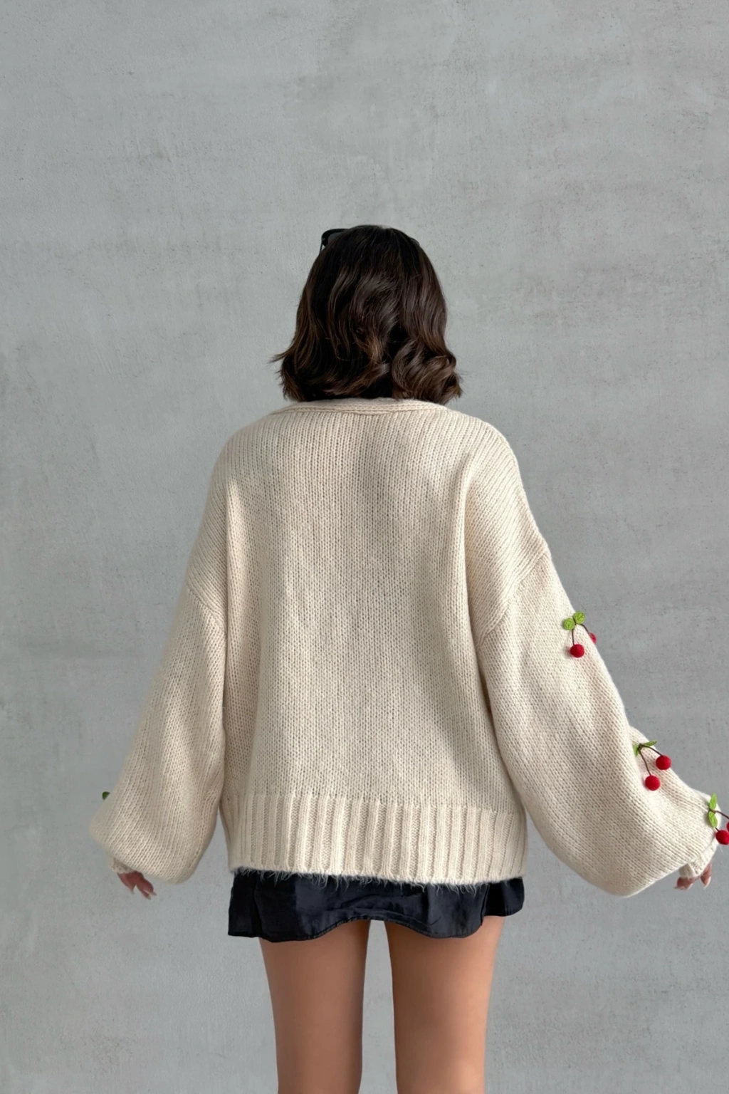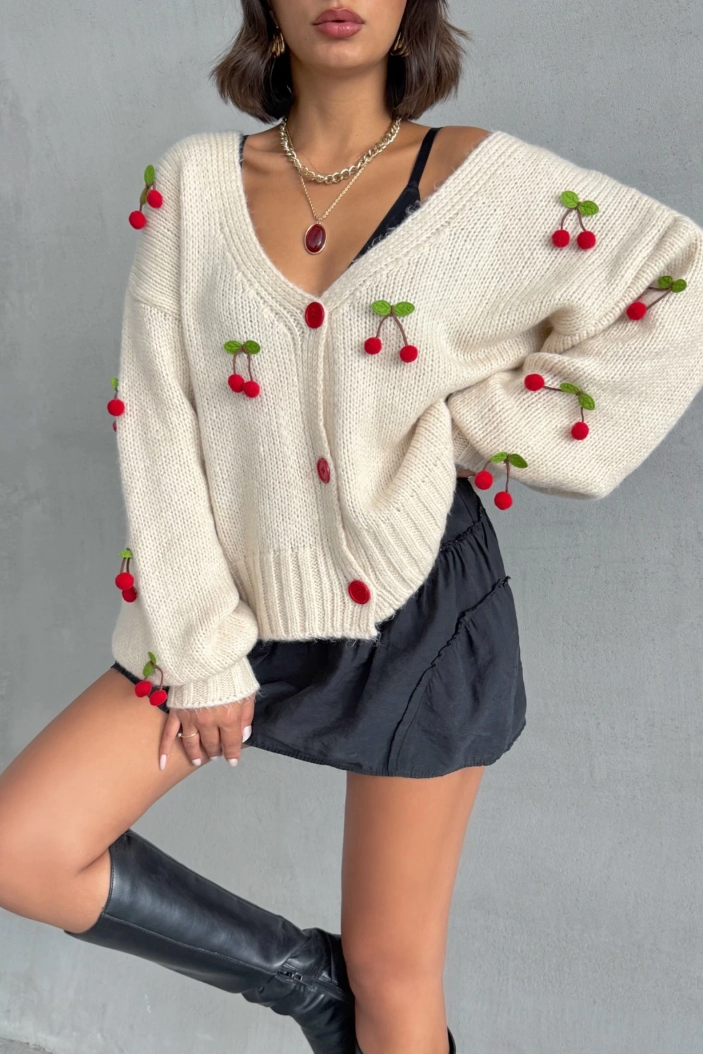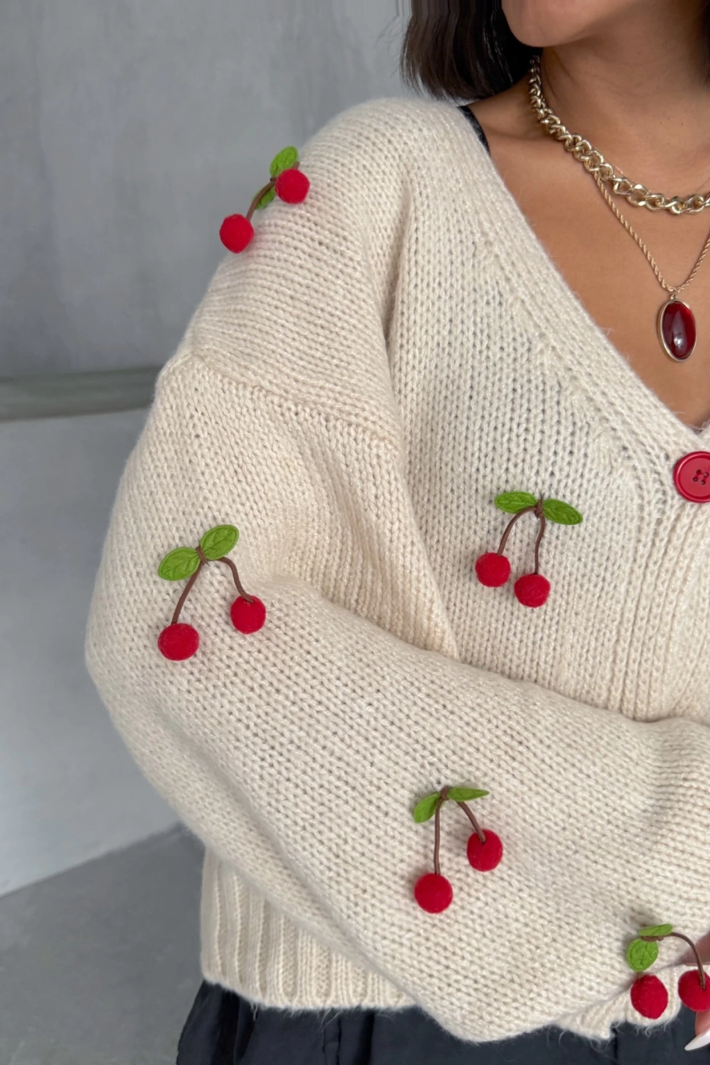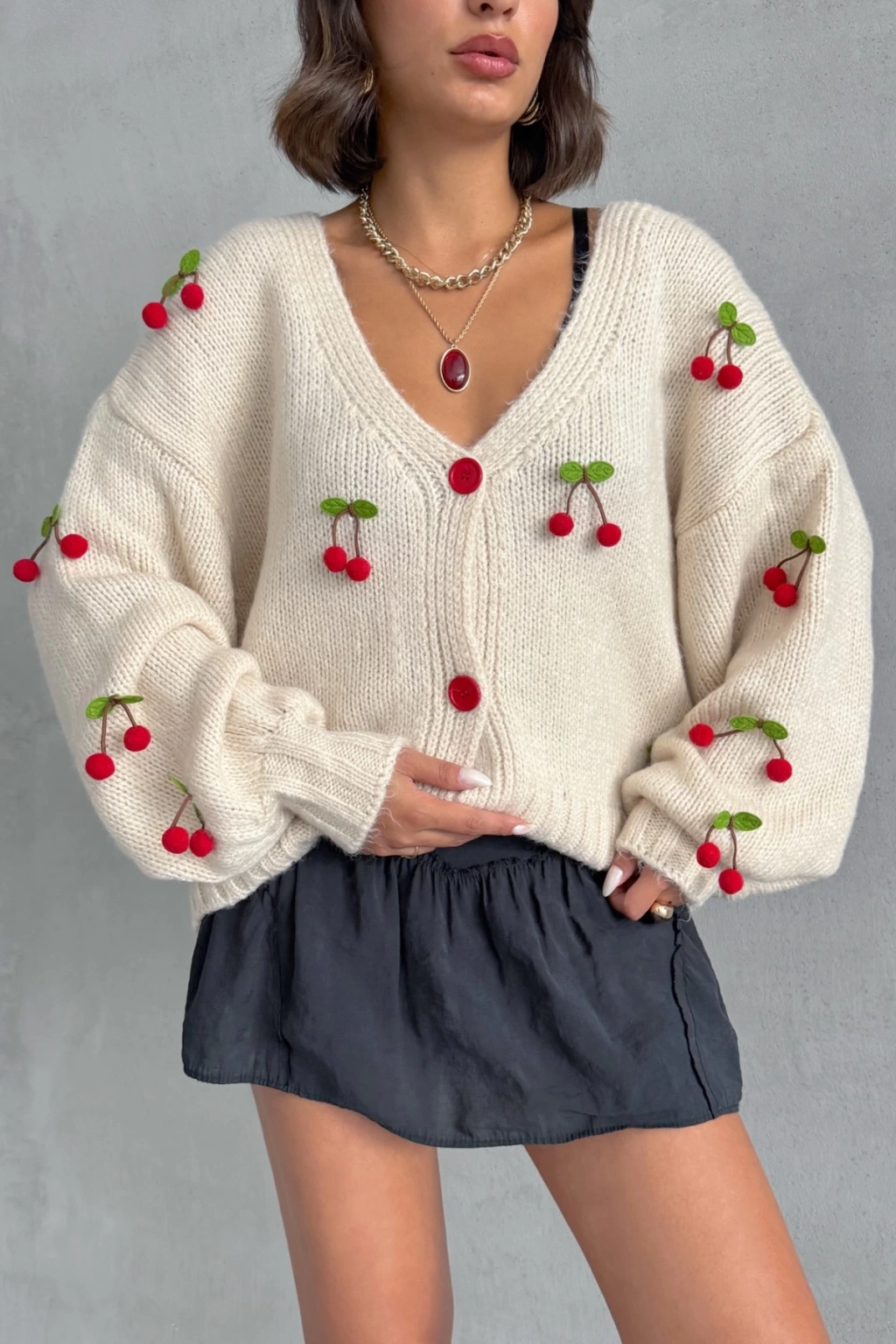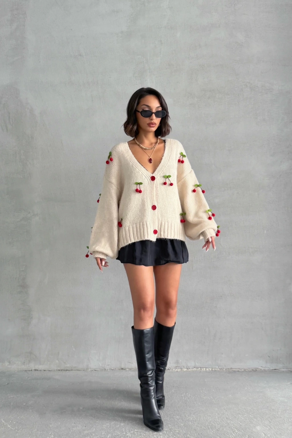 Gardırobunuza neşe katacak bu özel tasarım triko hırka, zarif dokusu ve sevimli kiraz aksesuarlarıyla tarzınıza eğlenceli bir dokunuş getiriyor. Yumuşacık triko kumaşı sayesinde hem sonbahar hem ilkbahar aylarında konforlu bir kullanım sunarken, detaylardaki özen sizi sıradanlıktan uzaklaştırıyor.