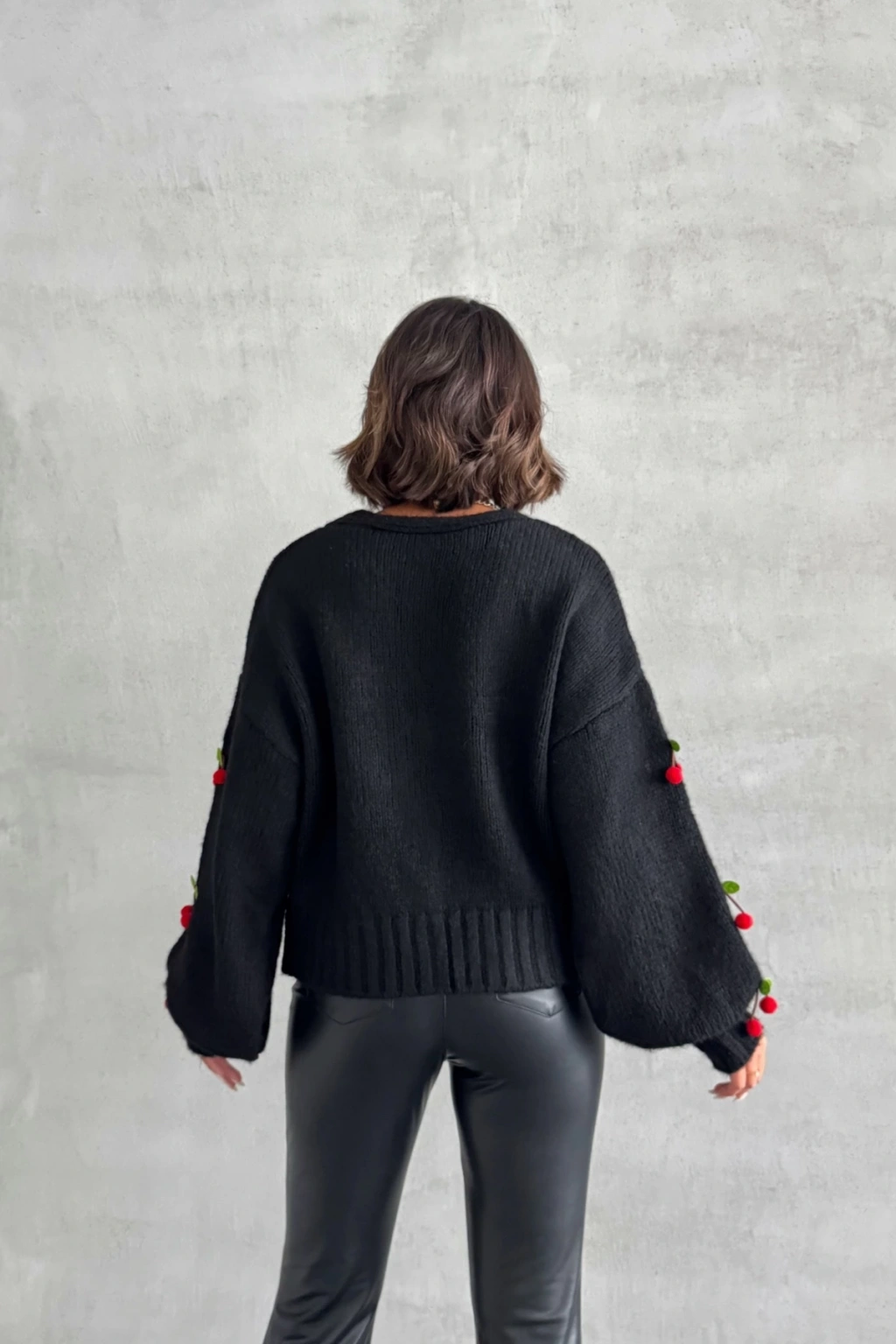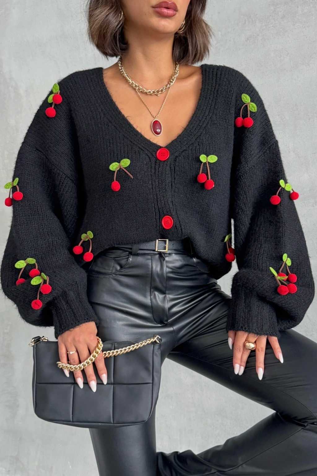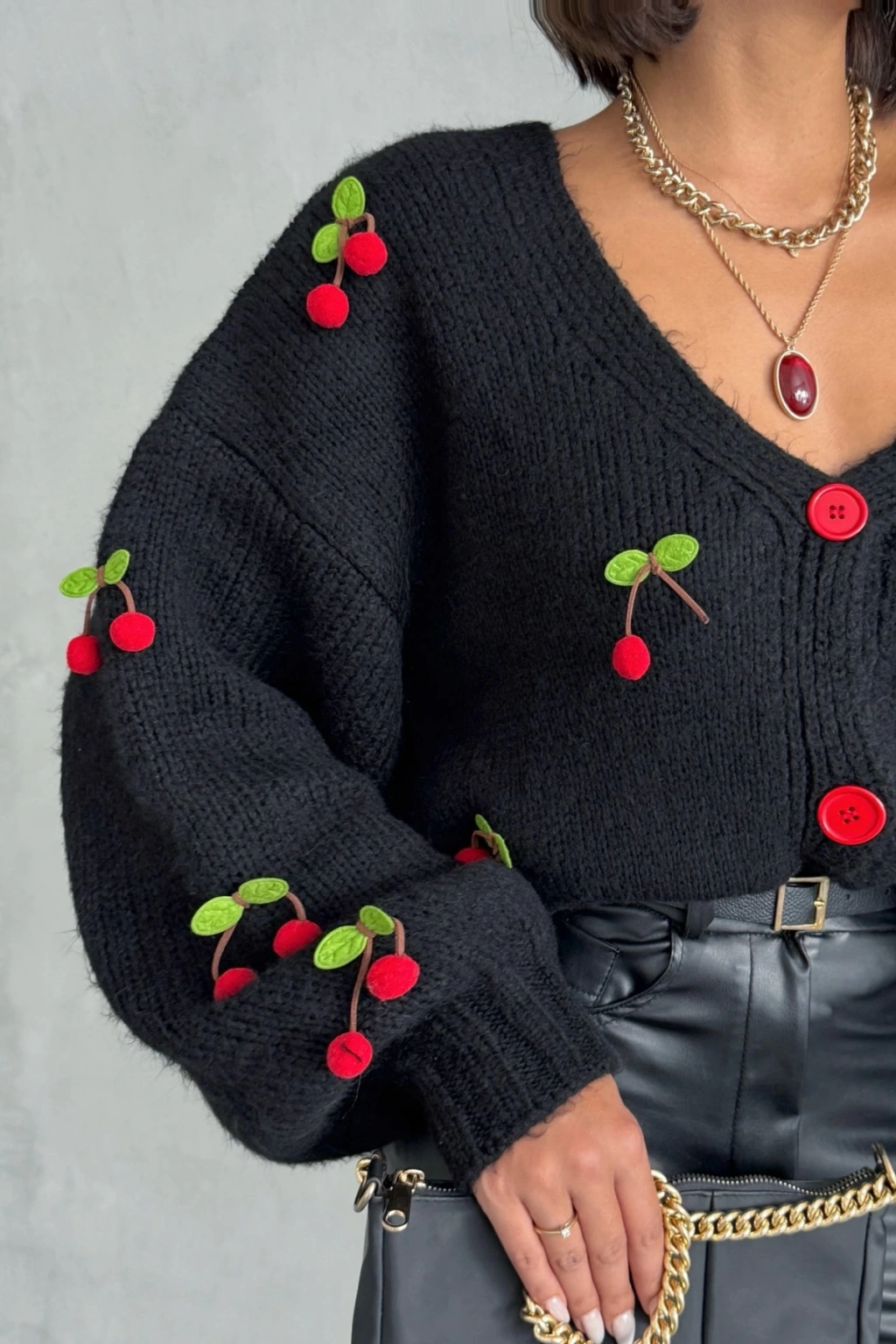 Gardırobunuza neşe katacak bu özel tasarım triko hırka, zarif dokusu ve sevimli kiraz aksesuarlarıyla tarzınıza eğlenceli bir dokunuş getiriyor. Yumuşacık triko kumaşı sayesinde hem sonbahar hem ilkbahar aylarında konforlu bir kullanım sunarken, detaylardaki özen sizi sıradanlıktan uzaklaştırıyor.