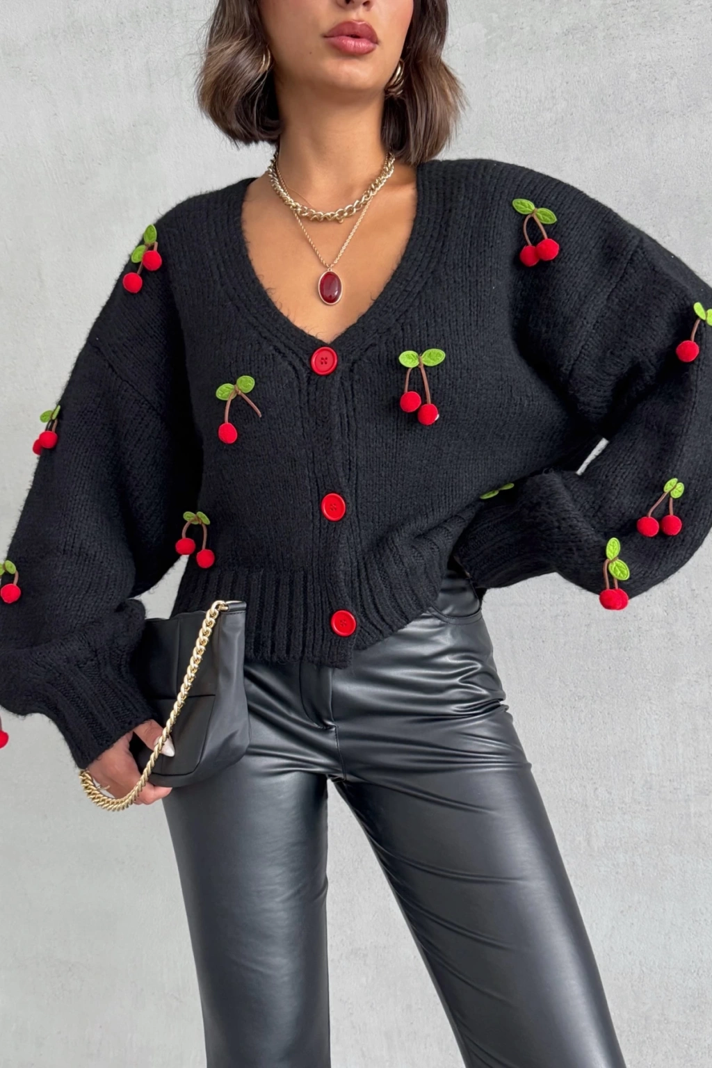Modern kesimiyle günlük stilinize kolayca uyum sağlar, ister kot pantolonla ister etekle kombinleyin; her daim farkınızı ortaya koyarsınız. Canlı renkleri ve dikkat çekici kiraz detaylarıyla bu hırka, enerjinizi yansıtmanın en tatlı yolu!