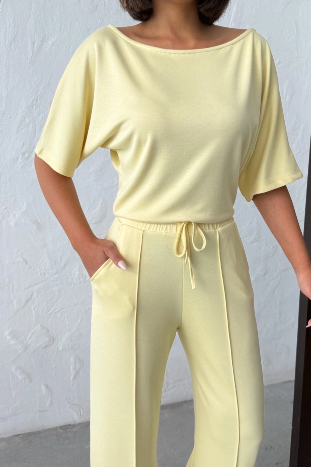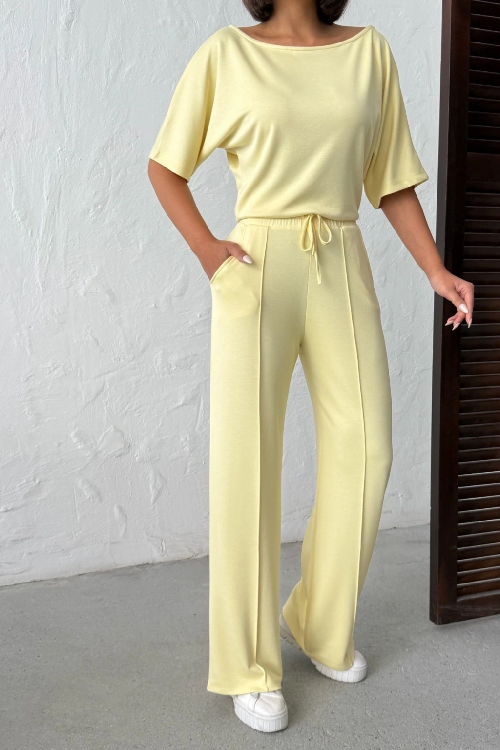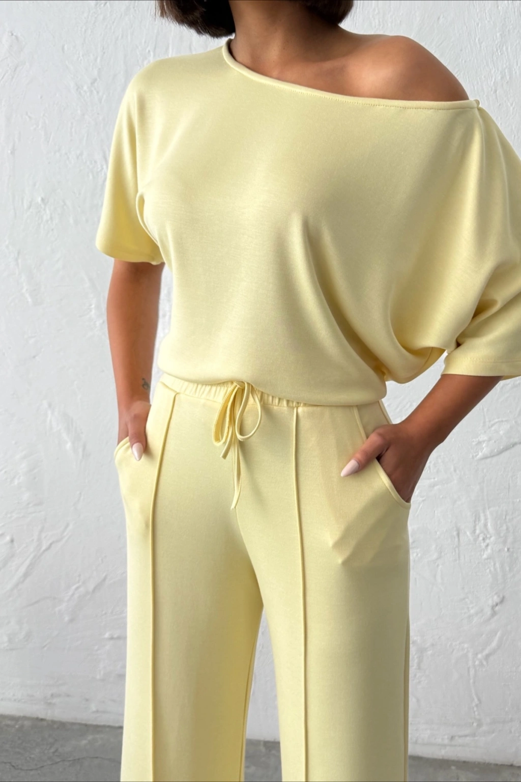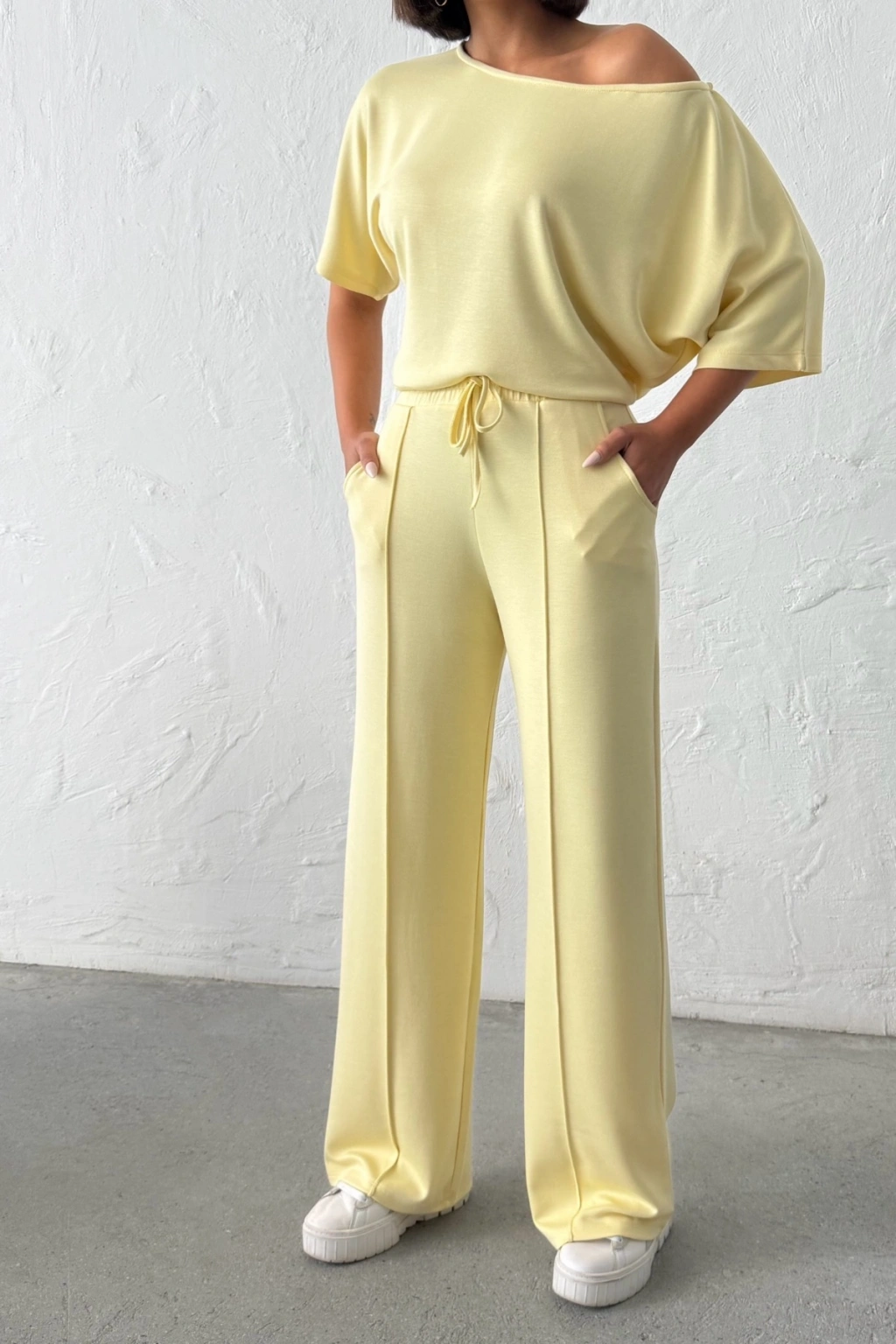 Kadın Yaz Sarısı Yumuşacık Yarasa Kol Bluzlu Beli Bağcıklı Geniş Paça İkili Takım