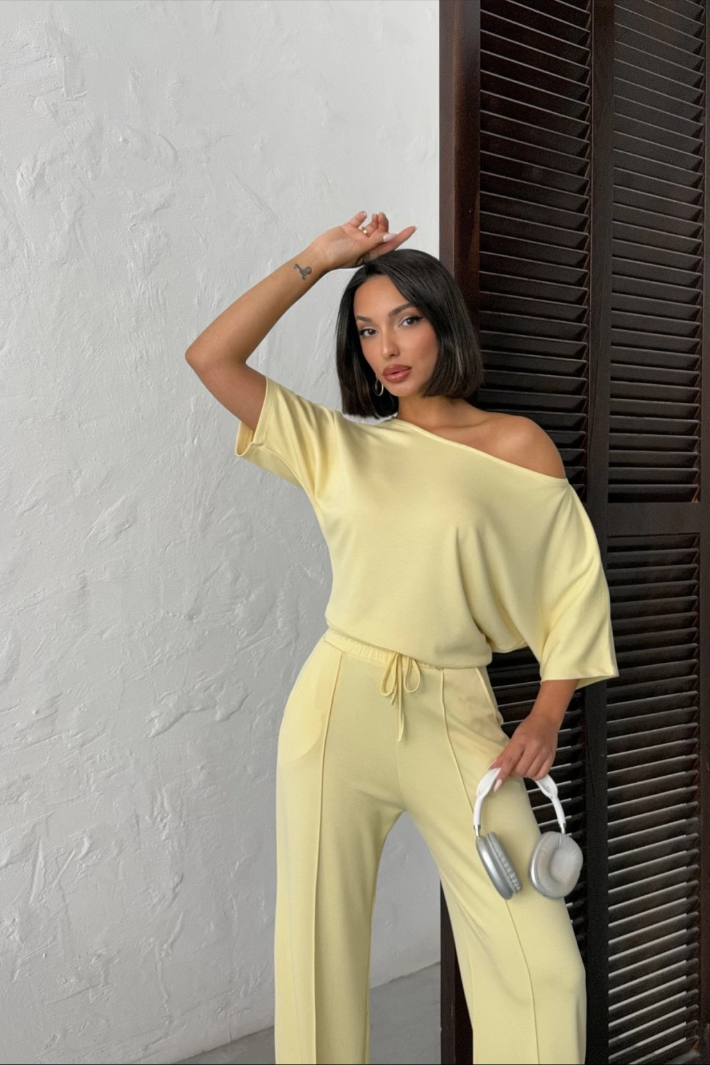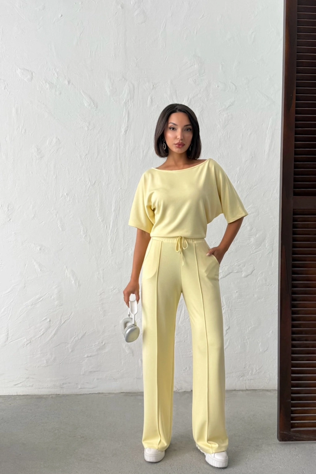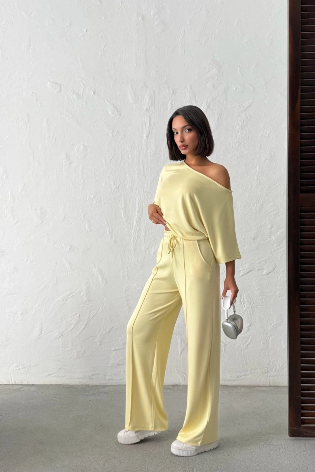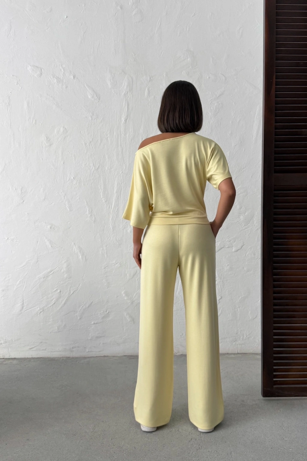 Kadın Yaz Sarısı Yumuşacık Yarasa Kol Bluzlu Beli Bağcıklı Geniş Paça İkili Takım