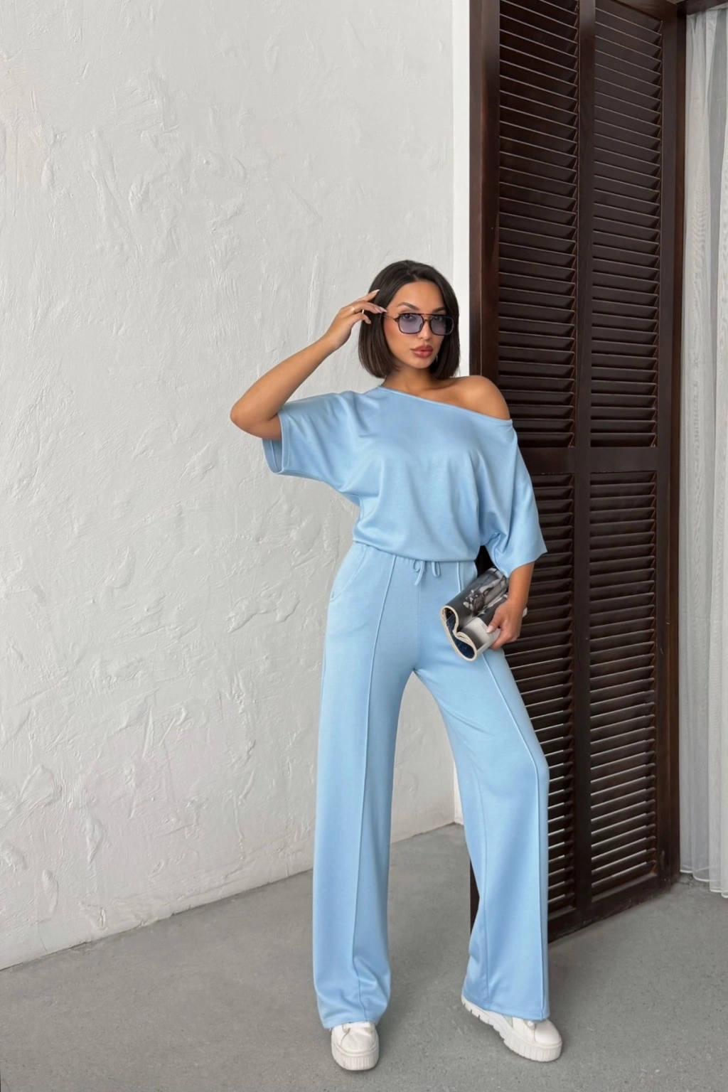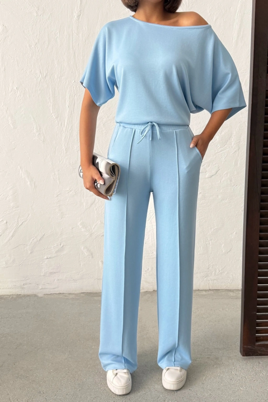 Kadın Yaz Mavisi Yumuşacık Yarasa Kol Bluzlu Beli Bağcıklı Geniş Paça İkili Takım