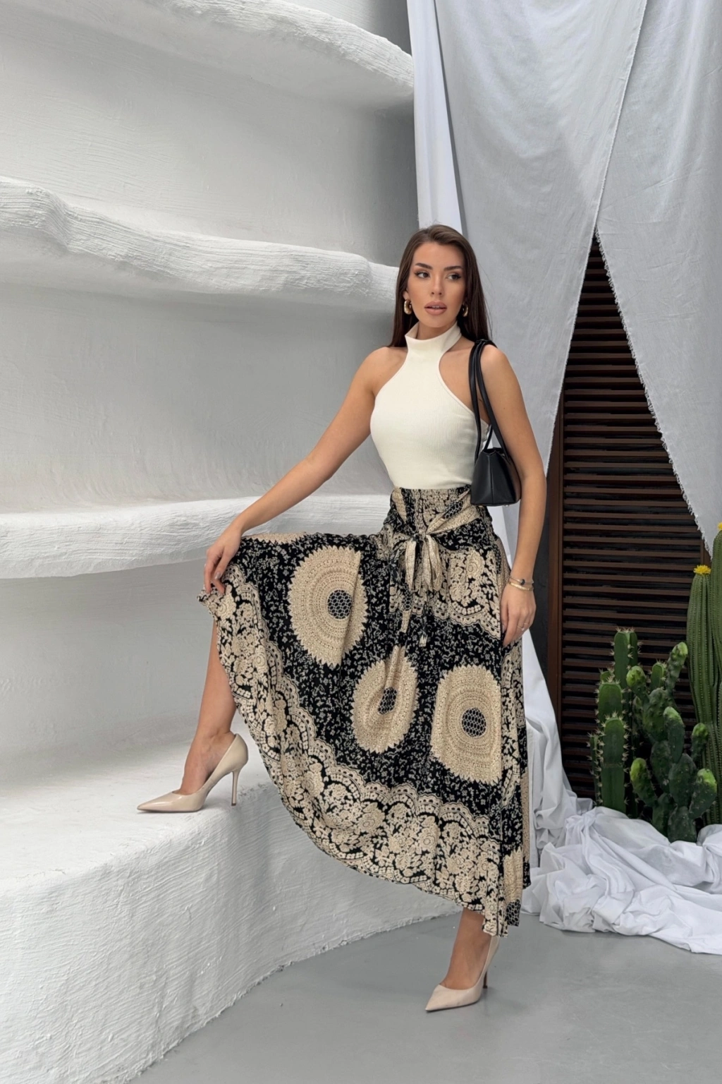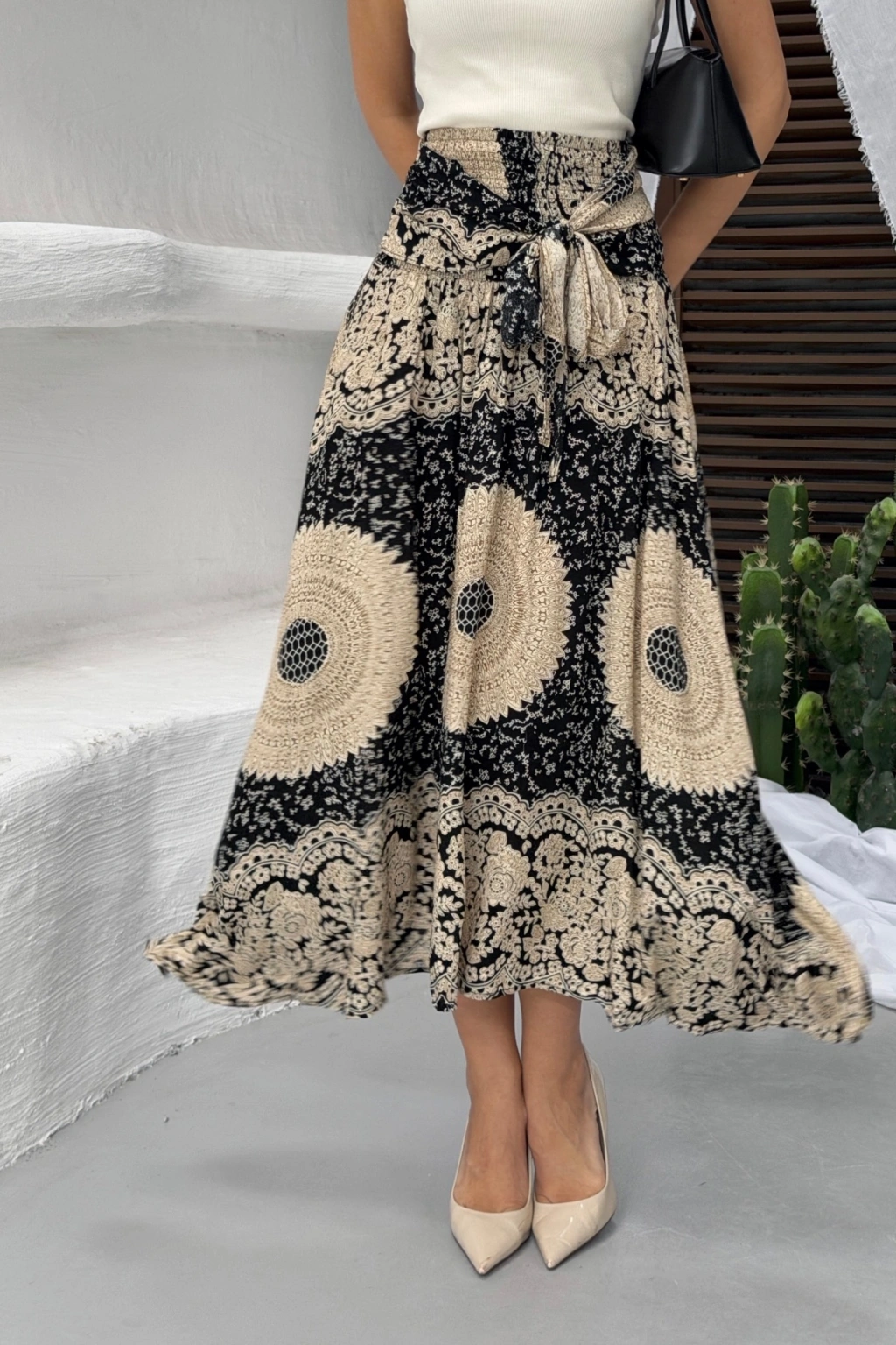 Kadın Siyah Yüksek Bel Bağlama Detaylı Şık Etnik Desenli Asimetrik Kesim Midi Etek