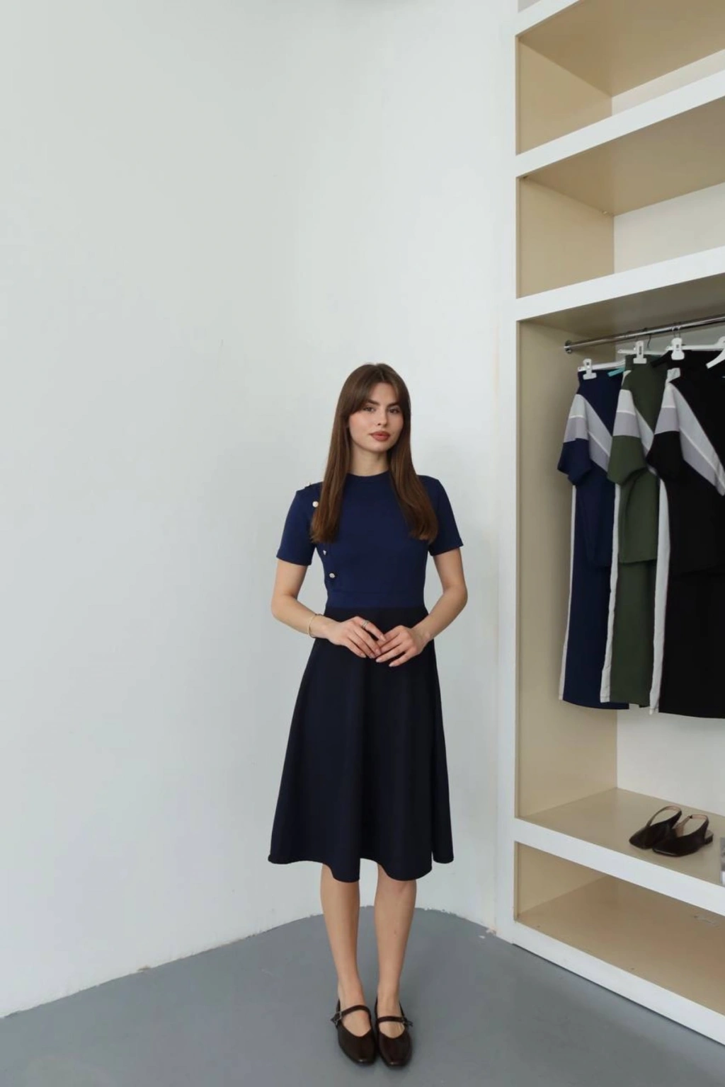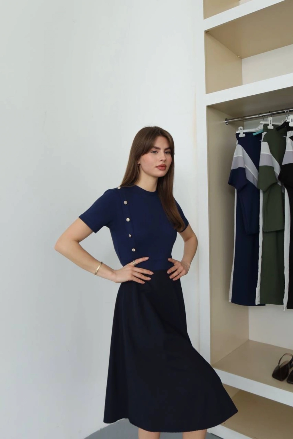 Kadın Lacivert Yan Düğme Detaylı Bisiklet Yaka Kısa Kollu Midi Boy Zarif Çan Etekli Elbise